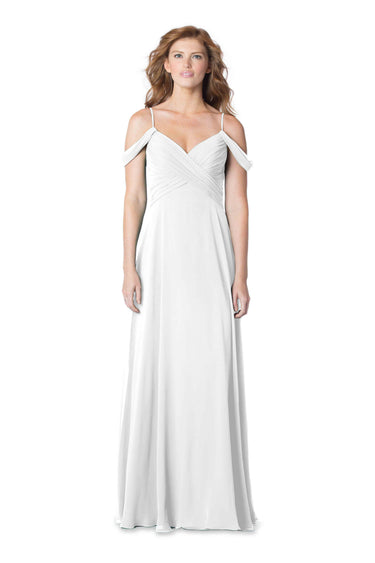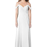 This enchanting creation is timeless elegance, and showcases an empire bodice adorned with overlapping pleats, a V-neckline, delicate spaghetti straps, and elegant off-the-shoulder drapes. The Bella Chiffon A-line skirt gracefully sways with an air of romance!