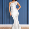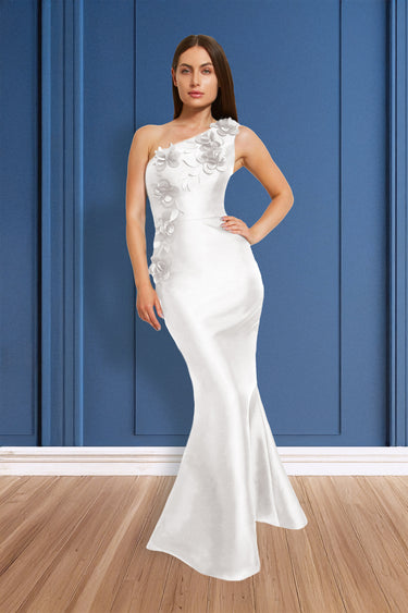 | One shoulder bodice with mermaid skirt with 3-D flowers cascading down the bodice and right hip. Mikado fabric. |