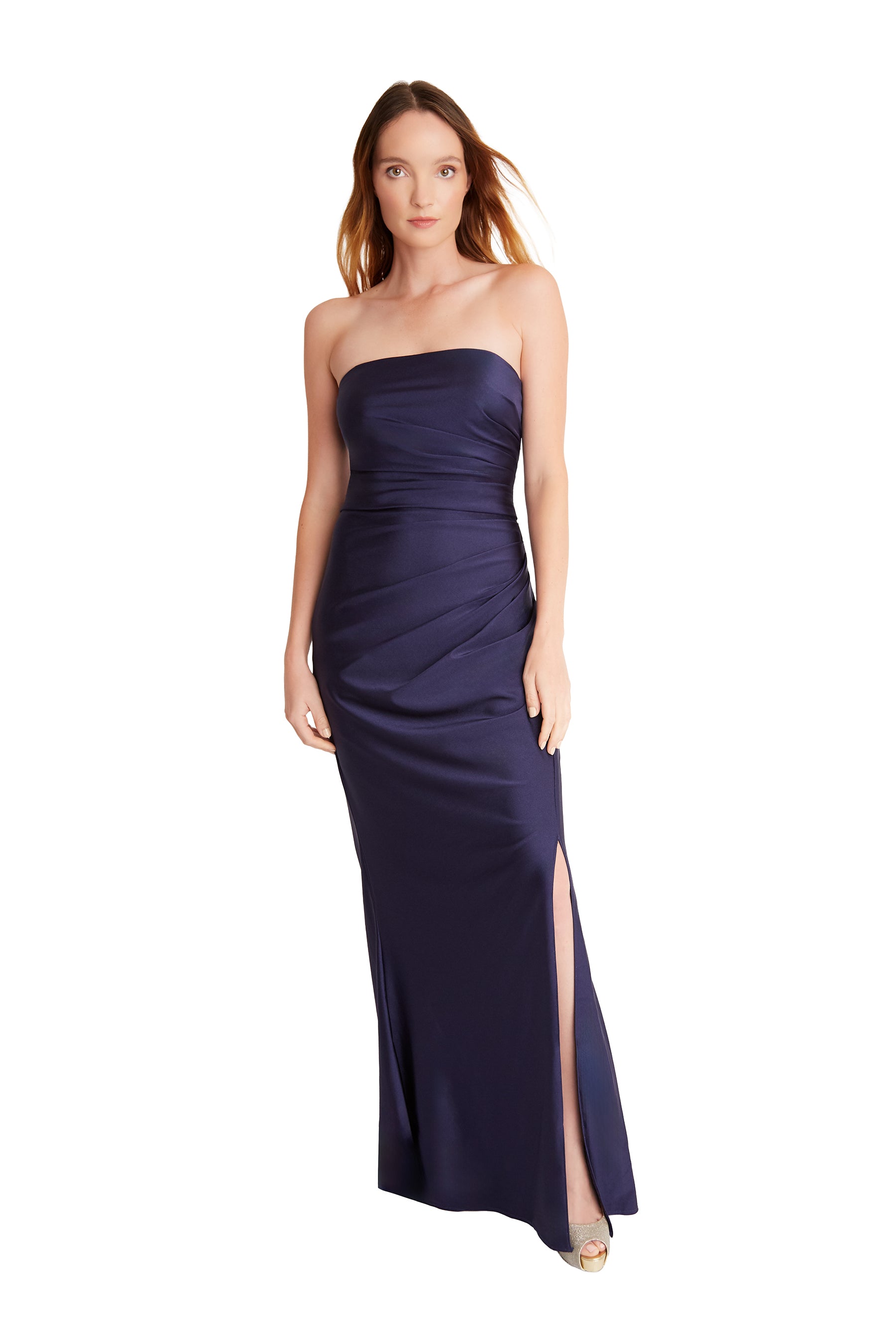 This sleek strapless gown is crafted from our luxurious 4-way stretch fabric that adapts to every move, while a removable scarf gives you instant style flexibility. A flirty side slit and delicate gathering accentuates every curve! This style is glamourous yet comfortable!