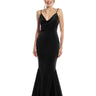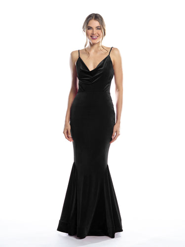 This playful dress features delicate spaghetti straps and a stretch velvet fabric that hugs your curves. The cowl neck bodice flows into a mermaid skirt, finished with godets and a fun horsehair hem that adds a flirty flair. Velvet elegance meets a chic twist!