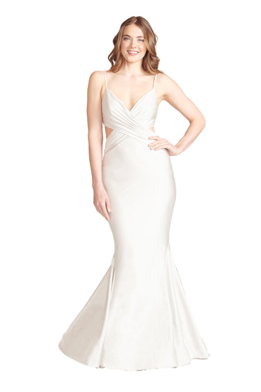Show off those curves in this sexy V-neck with spaghetti straps, criss-cross draping on the bodice, cheeky side cut-outs, and a bralette-style back. The mermaid skirt is finished with a horsehair hem and godets for extra movement! Crafted from 4-way stretch fabric for a flawless, effortless fit that accentuates all the right places. It includes self knee-length lining, but we recommend opting for full-length lining on lighter colors for additional coverage!