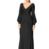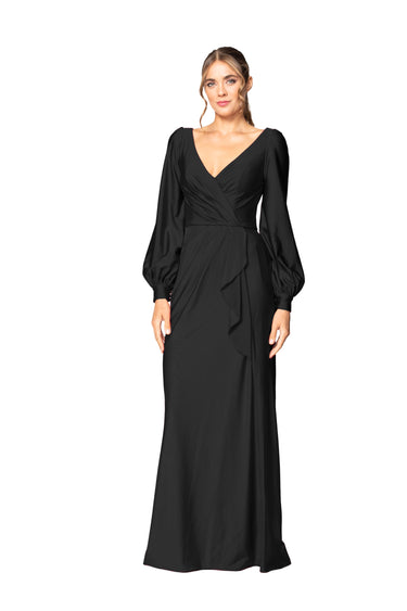 Make a striking impression with this bishop sleeve gown featuring a draped bodice and a faux wrap A-line skirt accented with a playful ruffle. Crafted from 4-way stretch fabric, it ensures a flawless, comfortable fit with a self-lined bodice. Designed with Lux Stretch for ease and comfort. For lighter colors, we strongly suggest adding a full-length lining for added coverage.