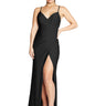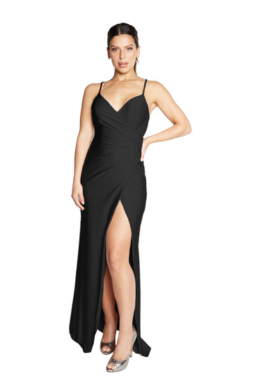 Slip into this flattering V-neck faux-wrap dress with flair! It flaunts asymmetrical pleats, dainty spaghetti straps, a criss-cross low back, and a cheeky slit. Crafted from 4-way stretch fabric, it hugs just right. Self-lined bodice for that smooth, seamless look.