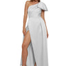 A fabulous one-shoulder design with a dramatic oversized bow on the shoulder and elegant draping across the bust. The faux wrap boasts a full A-line with pleats, adds a chic touch. Made with luxurious Mikado fabric.