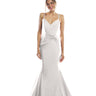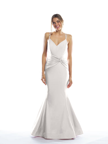 This V-neck dress features a playful knot at the waist and criss-cross straps for a flirty touch. The mermaid skirt is enhanced with godets and horsehair trim, creating a stunning silhouette. Made from 4-way stretch fabric, it offers a comfortable, flattering fit. It comes with a self knee-length lining, and for lighter shades, we suggest opting for the full-length lining to keep you feeling confident all day.
