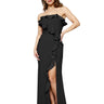 This strapless gown with a straight neckline is all about fun details—ruffles line the top and flow down to the hem, while a front side slit adds a cheeky twist. Made from stretch crepe for comfort and style.