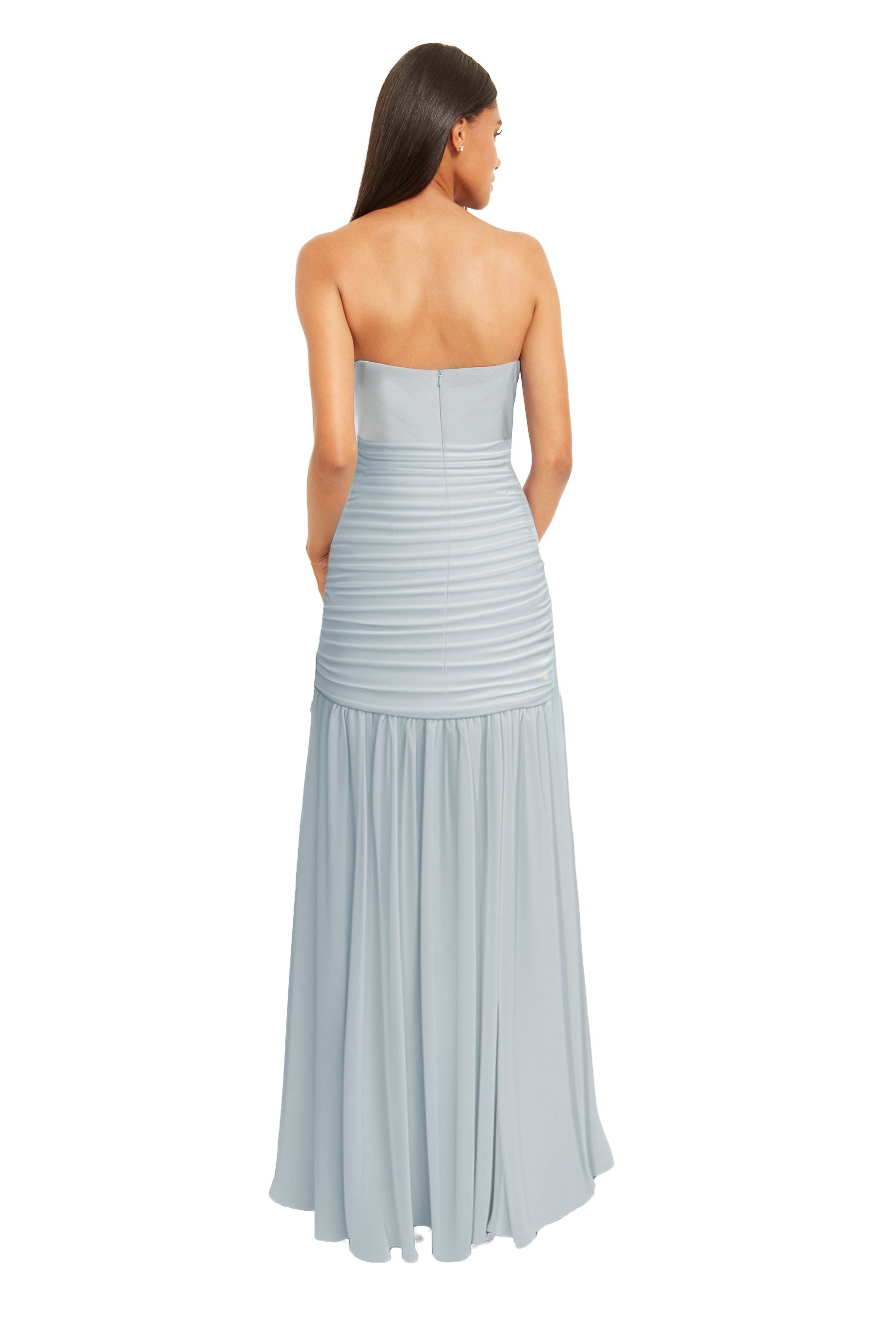Slip into effortless elegance with this strapless Bella Chiffon stunner. The ruched drop-waist bodice hugs in all the right places, while the sheer gathered skirt floats with romantic flair. Perfect for making a statement at any special occasion.
