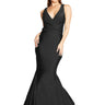 This daring dress showcases a gathered V-neck, a cinched cummerbund waistband, and a mermaid skirt detailed with godets and horsehair trim. Featuring an open lower back and crafted from 4-way stretch fabric, it offers a bold yet comfortable fit. The self knee-length lining provides coverage, with full-length lining recommended for lighter shades.
