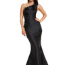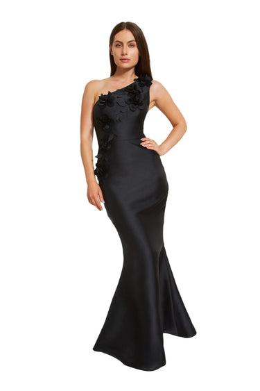 This charming design features a one-shoulder bodice teamed with a mermaid skirt, adorned with 3-D flowers that cascade beautifully from the bodice down to the right hip, all made from sumptuous Mikado fabric.