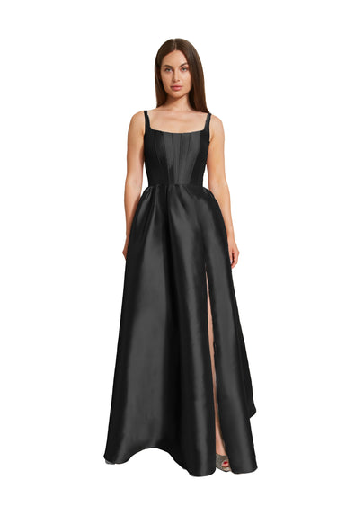 This exquisite gown features a square neckline and strong straps framing a structured boned bodice. The voluminous ball gown skirt cascades gracefully, enhanced by delicate gathering at the waist. Crafted from sumptuous Mikado fabric, it embodies timeless elegance.