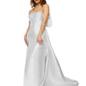 A stunning strapless sheath dress features an asymmetrical empire waist seam, high slit, and a removable large back bow. Choose from Solid Colors or 2-tone options.