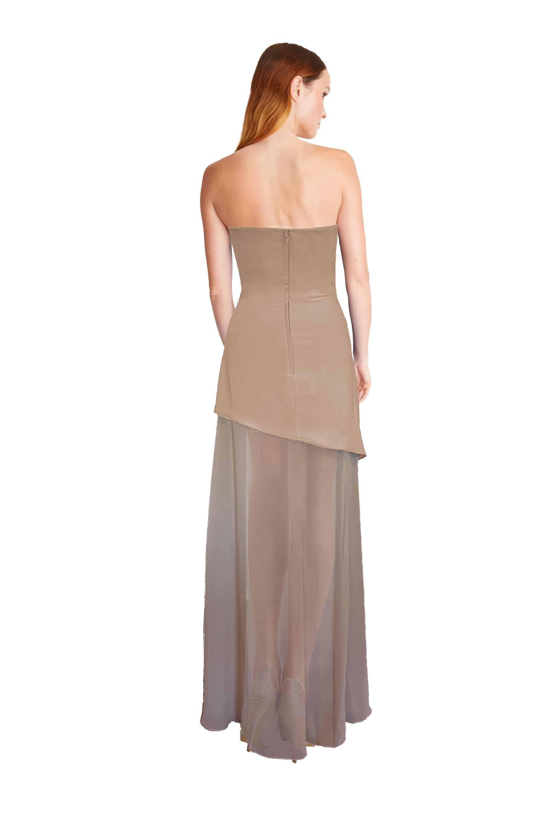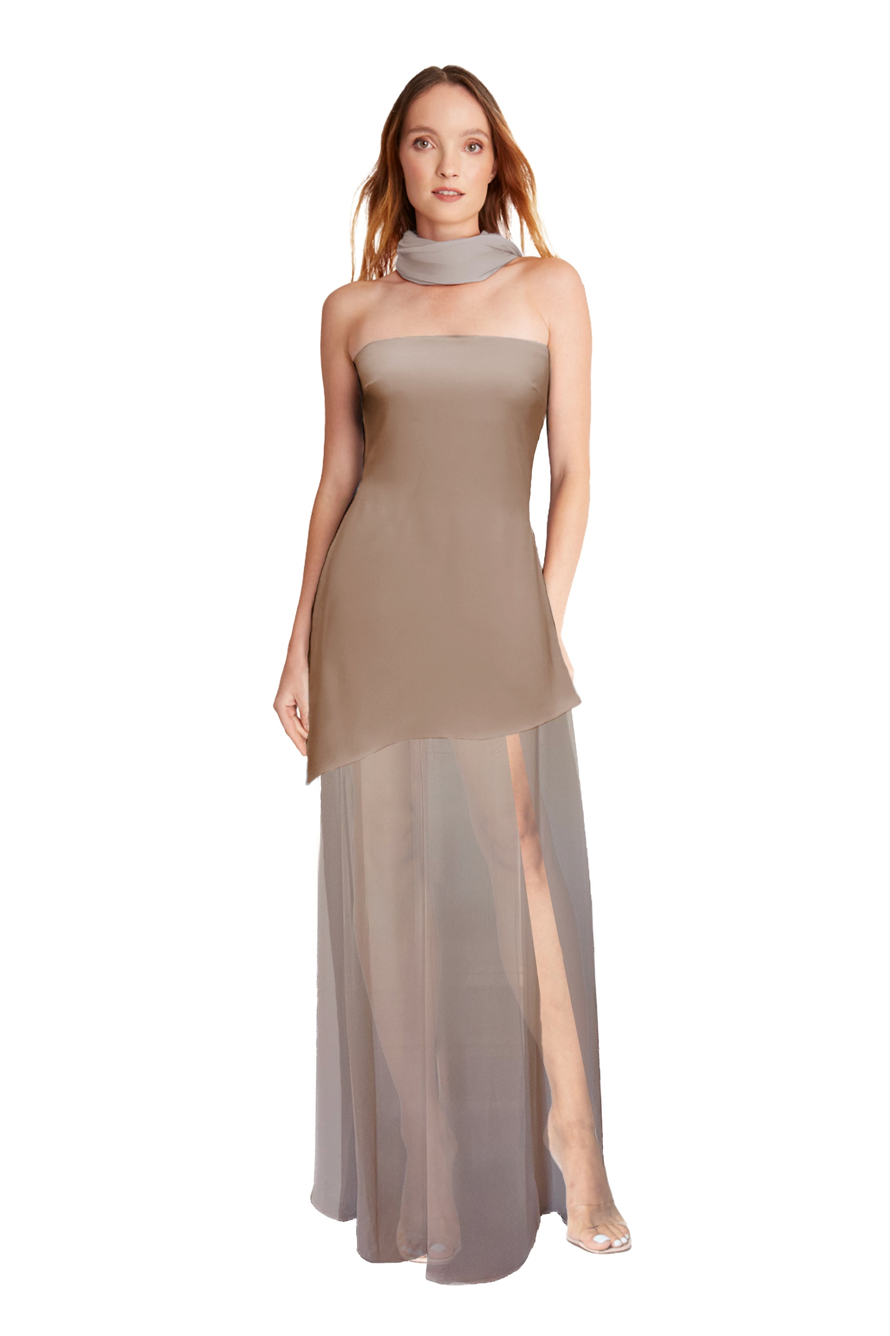 This striking design pairs a strapless Stretch Crepe asymmetrical mini dress with a sheer Bella Chiffon maxi skirt featuring a dramatic front slit. A coordinating Bella Chiffon scarf completes the look and can be detached for versatility. Currently available in select coordinating Stretch Crepe & Bella Chiffon colorways only.