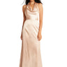 Elegant stretch charmeuse silhouette featuring a sophisticated blouson halter, button-detailed back closure, and streamlined A-line skirt. The fluid drape and refined construction create a polished, contemporary look perfect for formal occasions.