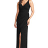 The design flaunts a sleek, tapered V-neck bodice paired with a diagonally pleated faux wrap skirt, complete with a graceful slit. The dress effortlessly combines elegance and comfort, making it a versatile choice for any occasion. Its modern silhouette is enhanced by the stretch crepe fabric, which not only ensures a flattering fit but also allows for ease of movement.
