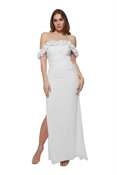 Get ready to make a statement in this stunning Bella Chiffon gown with an off-the-shoulder chiffon rose trim that just screams cottage-core! The pleating adds a touch of elegance, while the fitted A-line skirt with a flirty slit keeps things fun and playful. This Ā feminine silhouette delicately drapes your curves and is perfect for any occasion!