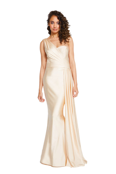 Elegant and striking one shoulder design with a draped sweetheart bodice, ruched side seam, and flowy cascading train. The mermaid skirt boasts a horsehair hem and is made of 4-way stretch fabric for a seamless, flattering fit. This style comes with a self knee-length lining and is crafted with luxurious stretch fabric. For light colors, we strongly suggest adding full length lining.