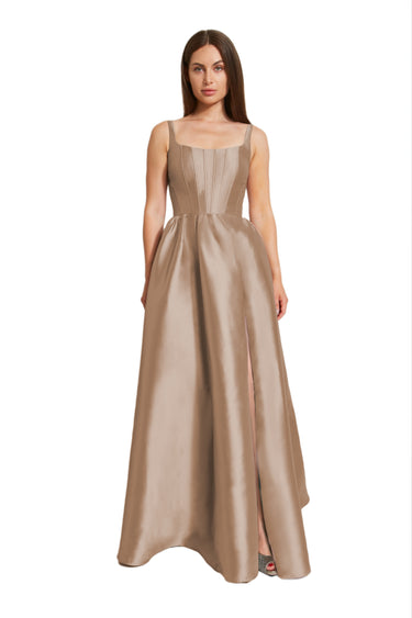 This exquisite gown features a square neckline and strong straps framing a structured boned bodice. The voluminous ball gown skirt cascades gracefully, enhanced by delicate gathering at the waist. Crafted from sumptuous Mikado fabric, it embodies timeless elegance.