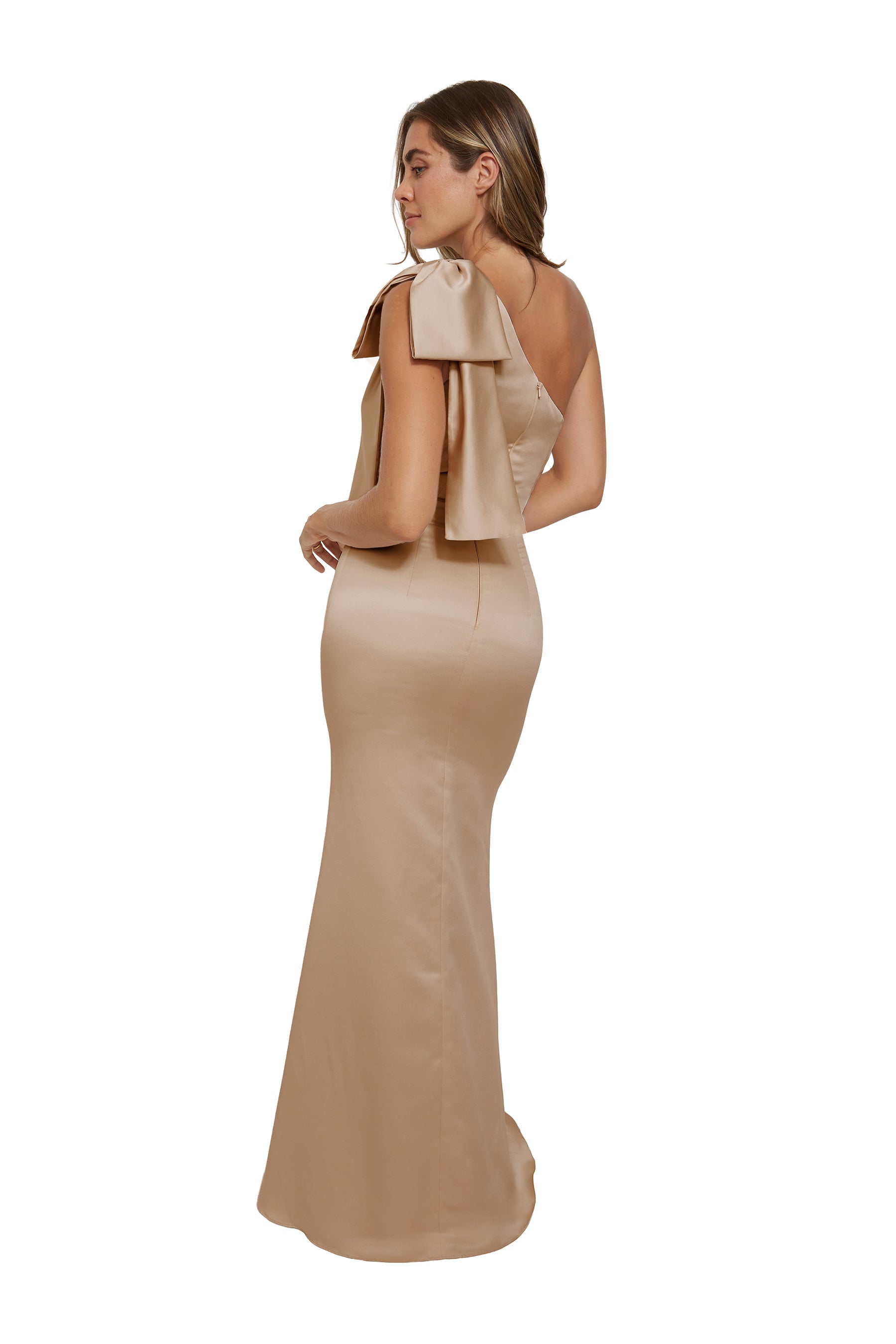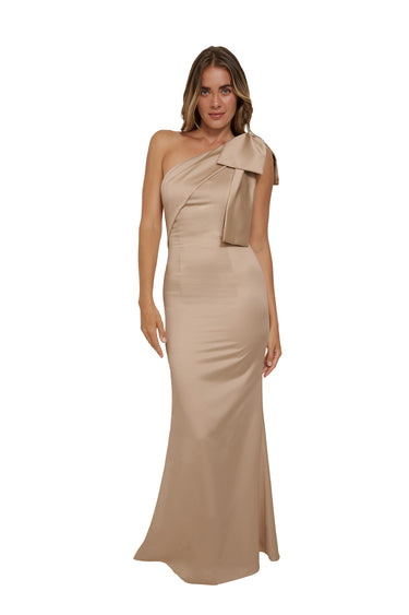 This elegant design features one shoulder adorned with a striking oversized bow and gentle draping over the bust. The skirt flows smoothly into a timeless silhouette, crafted from sumptuous Mikado fabric.