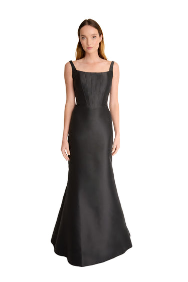A structured mikado gown featuring a chic square neckline, exposed boning that sculpts the bodice, a defined basque waist, and a dramatic trumpet silhouette that commands attention.
