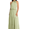 This stunning blouson halter gown features a 3D rose embellishment at the neckline and a daring open back design. The tiered A-line skirt creates beautiful movement and dimension, making it an unforgettable choice for your special occasion.