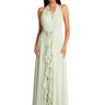Get ready to turn heads in this playful Bella Chiffon V-neck halter gown! Sheer ruffles frame the neckline, while subtle gathering accentuates your figure and showcases a dramatic 3D rose and cascading ruffle in the center of the gown. The flirty open back features a fun neck tie detail, and the billowing skirt gives you room to move and celebrate in style.