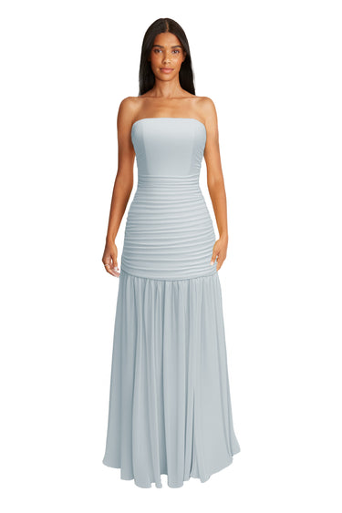 Slip into effortless elegance with this strapless Bella Chiffon stunner. The ruched drop-waist bodice hugs in all the right places, while the sheer gathered skirt floats with romantic flair. Perfect for making a statement at any special occasion.