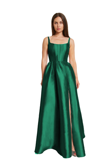 This exquisite gown features a square neckline and strong straps framing a structured boned bodice. The voluminous ball gown skirt cascades gracefully, enhanced by delicate gathering at the waist. Crafted from sumptuous Mikado fabric, it embodies timeless elegance.