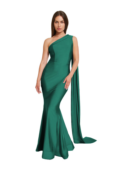 Steal the spotlight with a draped one-shoulder stunner! This showstopper flaunts a fold-over bodice and a mermaid skirt that’s ready to twirl with godets and a horsehair hem for that extra pizzazz. Made with our 4-way stretch fabric, it's as comfy as it is fabulous. Comes with a knee-length lining, but we suggest opting for full-length on those lighter shades for optimal coverage.