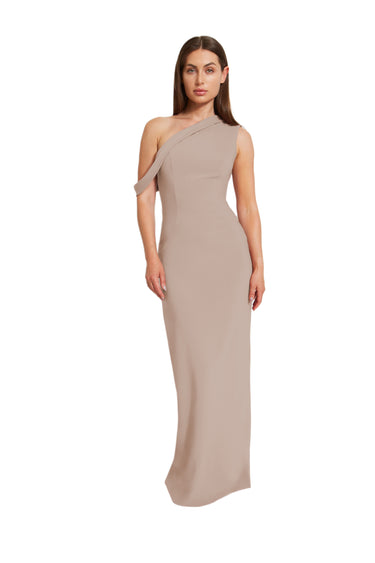 Indulge in the simplicity of a draped, single-shoulder top with a straight column silhouette, accented by princess seams and a center back slit. Crafted from Stretch Crepe, this style takes a subtle approach at defying convention.