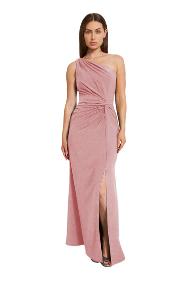 Enhance your wardrobe with our exquisite one shoulder gown, featuring delicate pleats that elegantly gather into a faux knot at the waist. Paired with a slim A line skirt, boasting a flattering slit and subtle waist gathering. Made from luxurious Stretch Crepe material for a sophisticated touch.