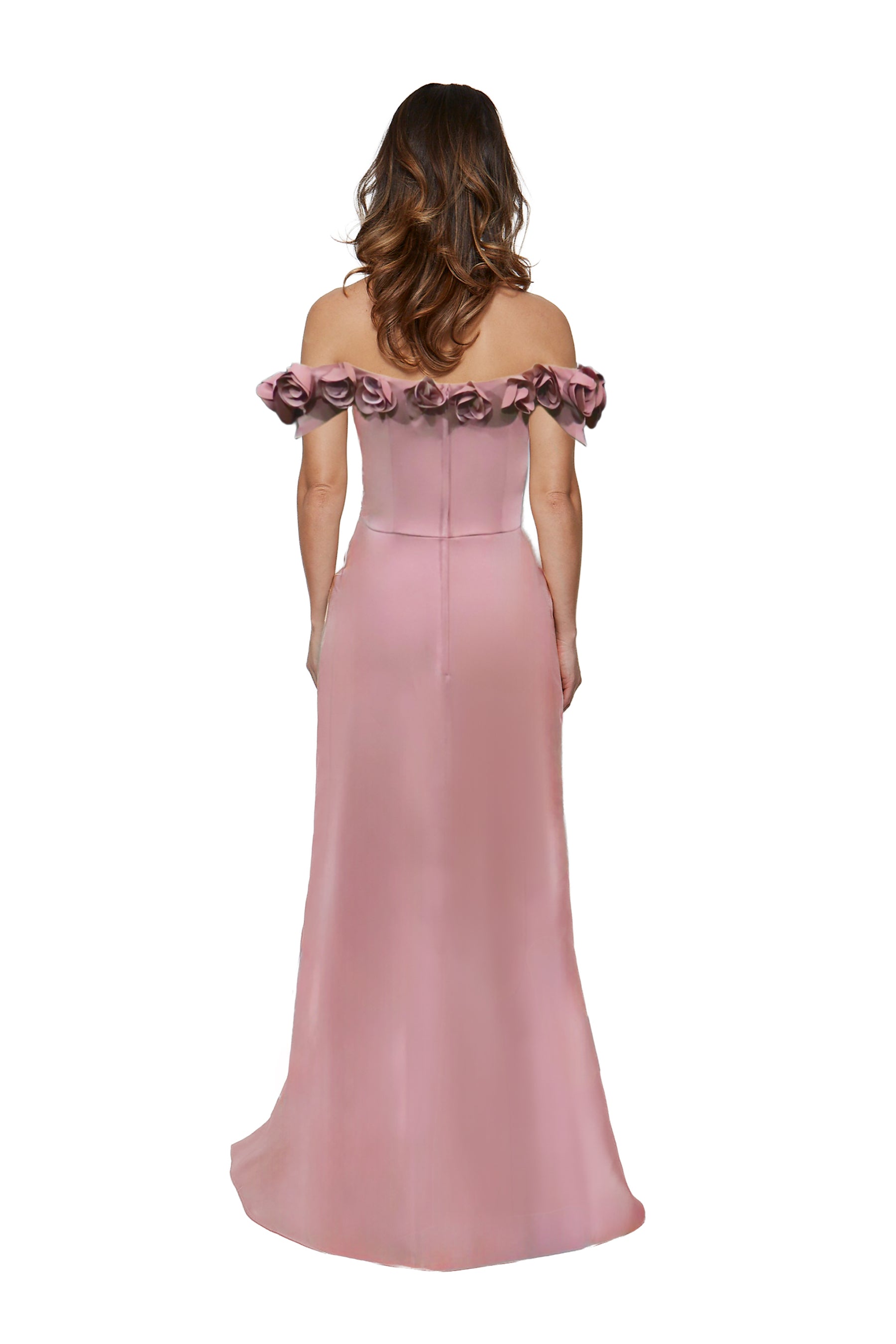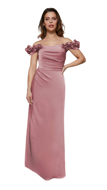 This A-line beauty hugs your curves with shiny stretch crepe while the pleated bodice flatters the figure. Off-the-shoulder drapes flaunt fabulous 3D roses—perfect for that feminine touch!