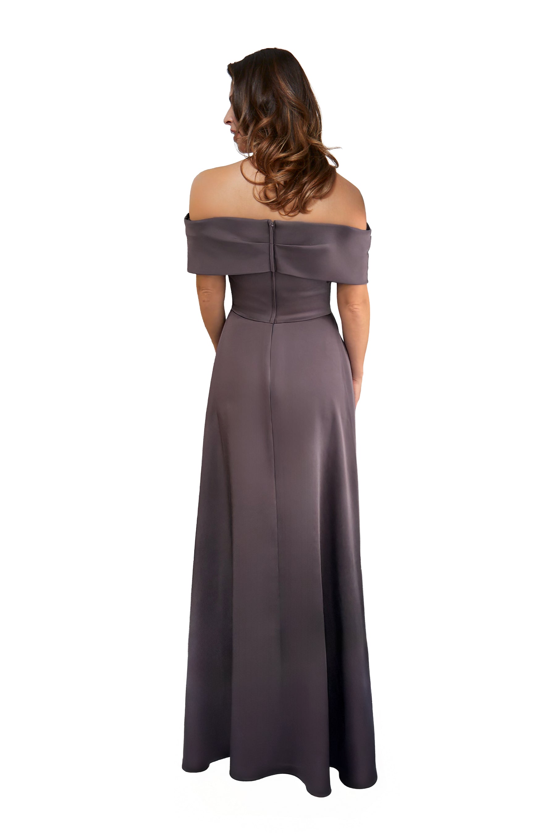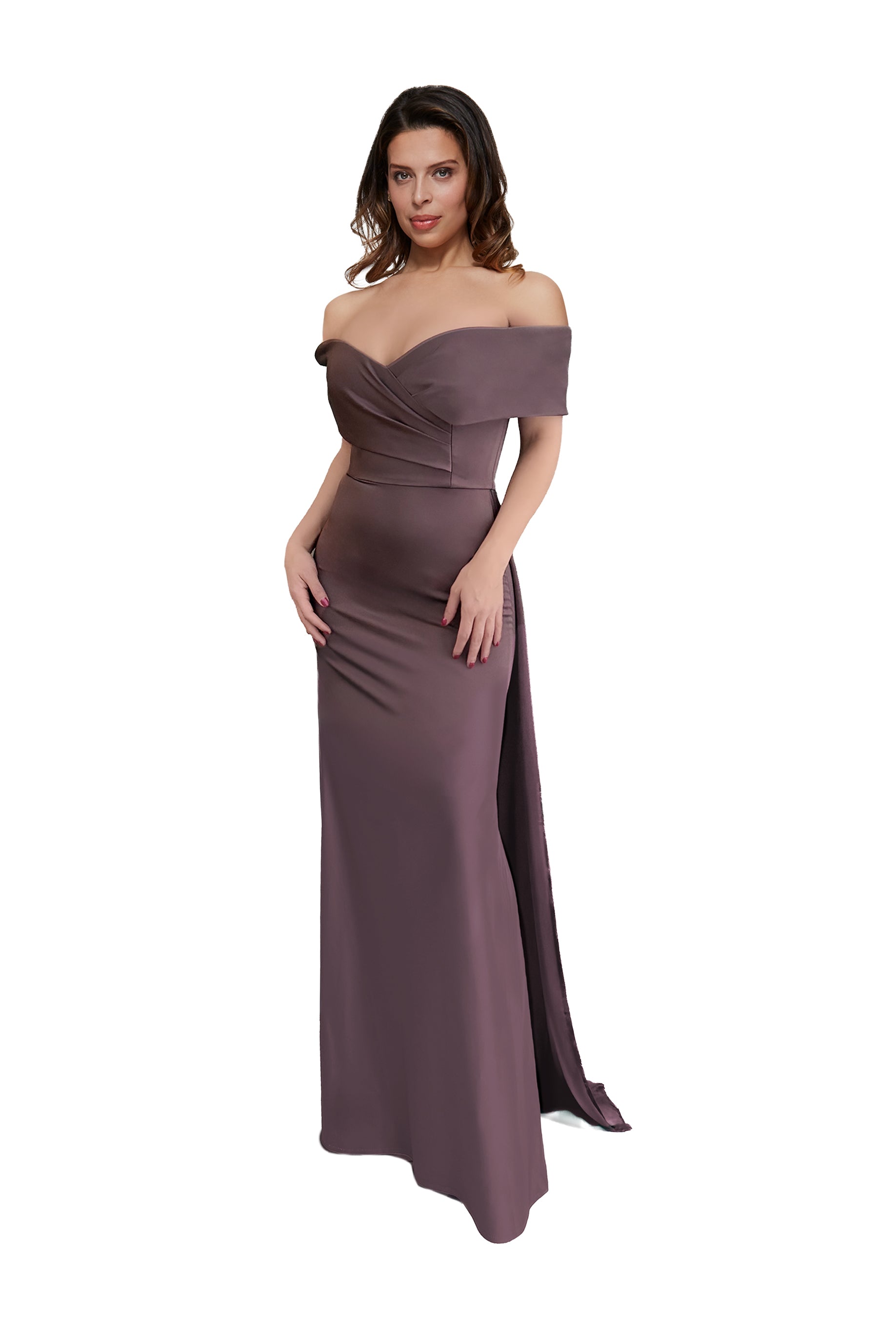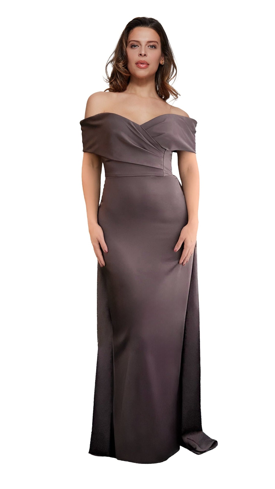 Introducing the M2608, an exquisite off-the-shoulder portrait gown crafted from shiny stretch crepe that gracefully flatters the silhouette. The straight skirt features a back slit and a dramatic floor-length flowing back panel, evoking a sense of timeless elegance.