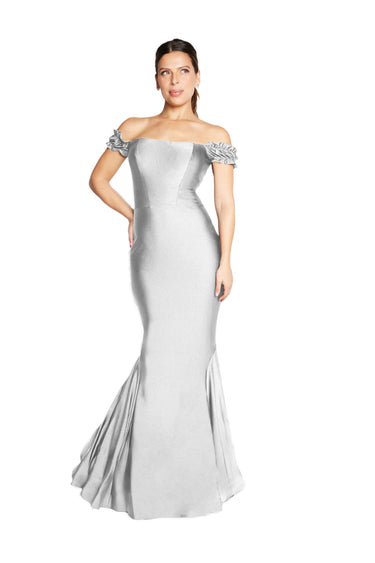 Shoulder-baring ruffles add a touch of romance to this mermaid silhouette dress, complete with princess seams, godets, and horsehair trim. Made from 4-way stretch fabric for an effortless fit, it also comes with a knee-length lining. For light colors, we suggest ordering a full-length lining for best results.